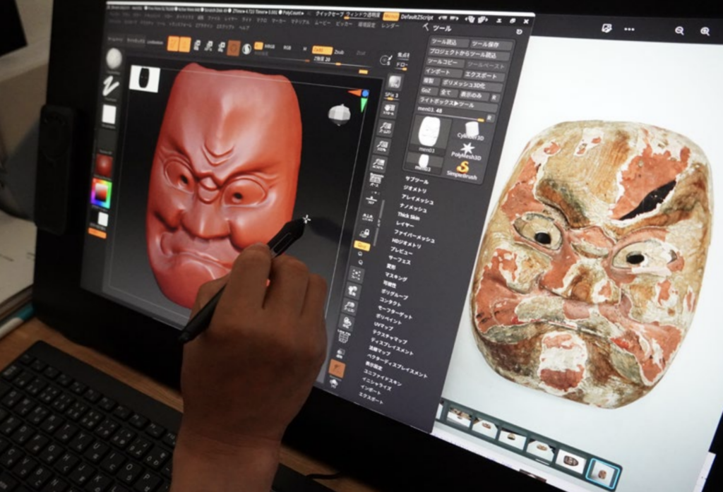 この取り組みは、明治時代に神社から散逸してしまった古面を、現所有者の了解を得たうえで3Dスキャンし、古面の復元・新調を行い、さらに実際に祭りで使用するという試みです。
