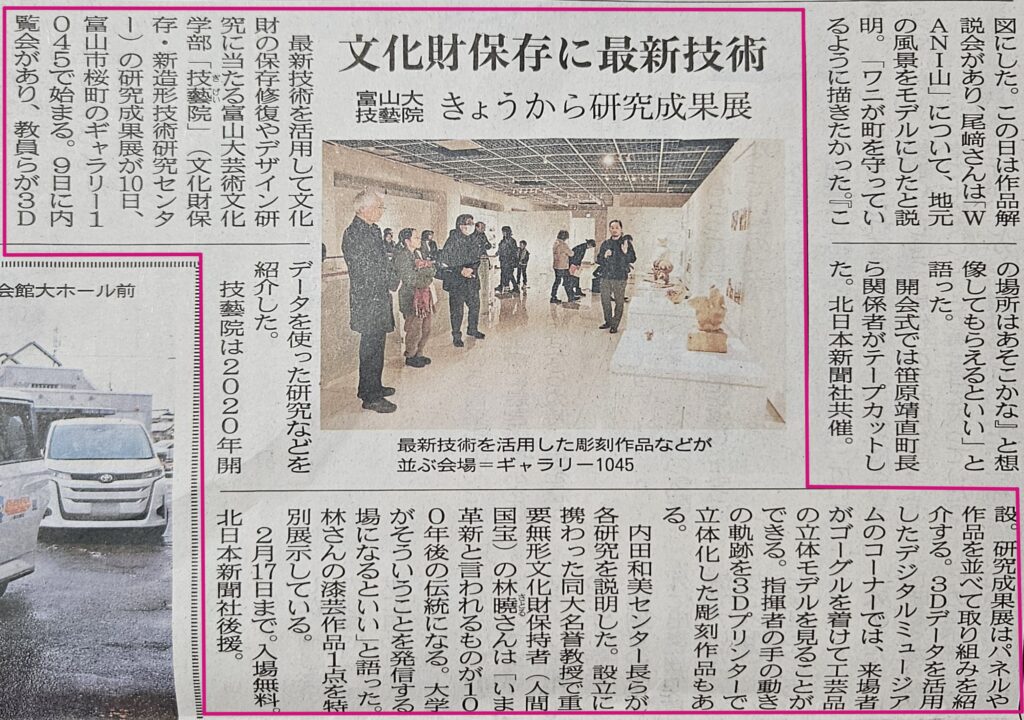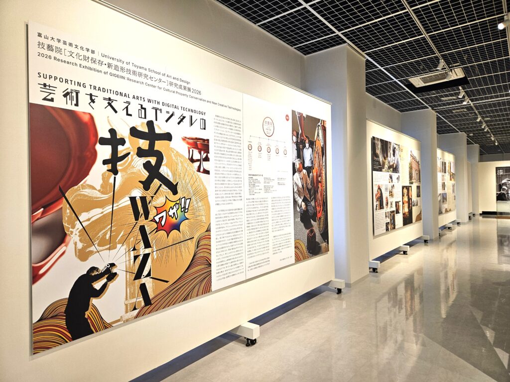技藝院のこれまでの研究・活動成果展である「芸術を支えるデジタルの技 富山大学芸術文化学部附属 技藝院 [文化財保存・新造形技術研究センター] 研究成果展 2026」が、2026年1月10日(土)に開幕しました(写真1)。