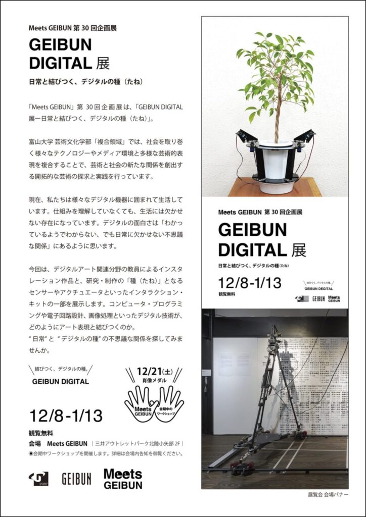 2024年12月8日(日)から2025年1月13日(月・祝)まで、Meets Geibun(三井アウトレットパーク北陸小矢部 2F)にて、展覧会「GEIBUN DIGITAL展 ― 日常と結びつくデジタルの種(たね)」が開催されました。本展において、技藝院の三上拓哉特命助教(当時)が展示およびワークショップを行いました。